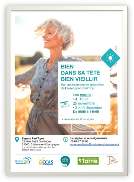 Dans cette optique, le CCAS de Châlons-en-Champagne, en partenariat avec l’Association Brain Up, propose un cycle de 5 ateliers thématiques pour « être bien dans sa tête pour bien vieillir ».