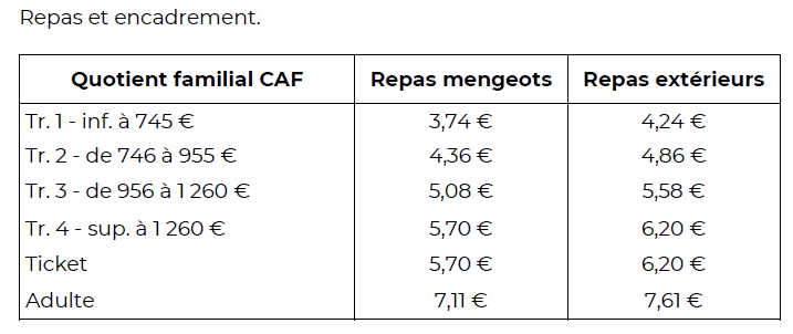 TARIFS CANTINE SCOLAIRE