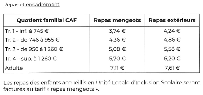 TARIFS CANTINE SCOLAIRE
