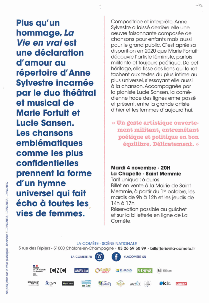 Plus qu’un hommage, La Vie en vrai est une déclaration d’amour au répertoire d’Anne Sylvestre incarné par le duo théâtral et musical de Marie Fortuit et Lucie Sansen. Les chansons emblématiques comme les plus confidentielles prennent la forme d’un hymne universel qui fait écho à toutes les vies de femmes.