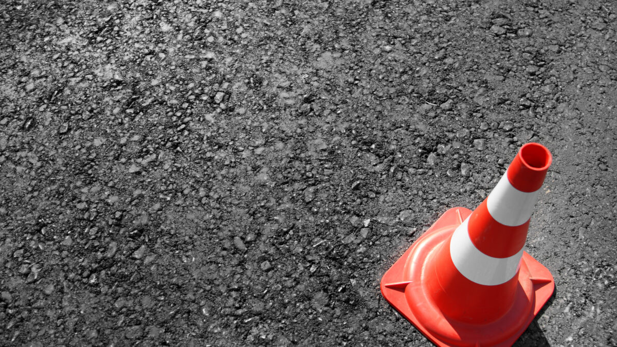 traffic cone, with white and orange stripes on gray asphalt, copy space.